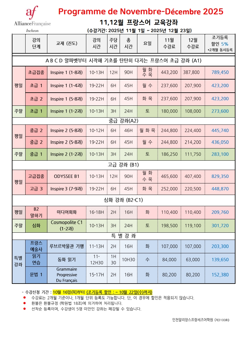 이번 2025년도 11-12월 프랑스어 강좌는 11월 1일(토) - 12월 23일(화) 동안 진행됩니다. 수업에 따라 강의 시작 후에도 중도 수강 가능합니다 :) * 학기는 2달 단위로 진행되며, 수강료는 2개월 기준이나 1개월 분할 결제도 가능입니다. (단, 이 경우에는 할인은 적용되지 않습니다.) (수강생이 5명 미만인 강좌는 폐강될 수 있으며, 폐강 시 결제한 수강료는 전액 환불됩니다.) ** 신규 수강자분들은 수강신청 전에 먼저 수강상담을 받으시기를 권해드립니다. 전화 예약 후 방문. (프랑스어를 아예 처음 배우거나 본인의 프랑스어 레벨을 정확하게 알고 있는 분이라면 수강상담이 필수는 아닙니다.) - 문의전화 : 032) 873-5556, 5550 - 카카오톡 : 인천알리앙스프랑세즈어학원 / allianceincheon - 상담가능시간 : 월,화,수,목 (10시-13시 & 15시00분-18시30분) / 토 (10시-12시30분) (점심시간인 13시-14시 30분에는 전화 받지 않습니다.) ____________ * 인천 이음카드 사용 가능 합니다. ___________ * 수강신청 방법: 직접 방문 혹은 위 연락처 (032-873-5556, 5550)로 “성함, 원하시는 강의명”을 말씀해주시길 바랍니다. * 수강료 결제방법: 계좌이체 / 신용카드(방문시) 가능 신한은행 110-548-199279 *현금영수증 발급을 원하시는 분들은 수강신청시 말씀해주시고, 송금시 예금주 성명이 본인과 다를 경우 반드시 사전에 알려주시기 바랍니다. ____________ ※ 인천 알리앙스는 교육청의 환불규정(학원법 18조)을 준수하며, 교습기간을 기준으로 환불의사 통보 시점에 따라 반환금액이 상이하오니 자세한 환불규정의 숙지바랍니다. 환불시 반환금액은 할인 적용 전 수강료를 기준으로 계산됩니다. ____________ 인천 알리앙스 프랑세즈 어학원 제 3100호