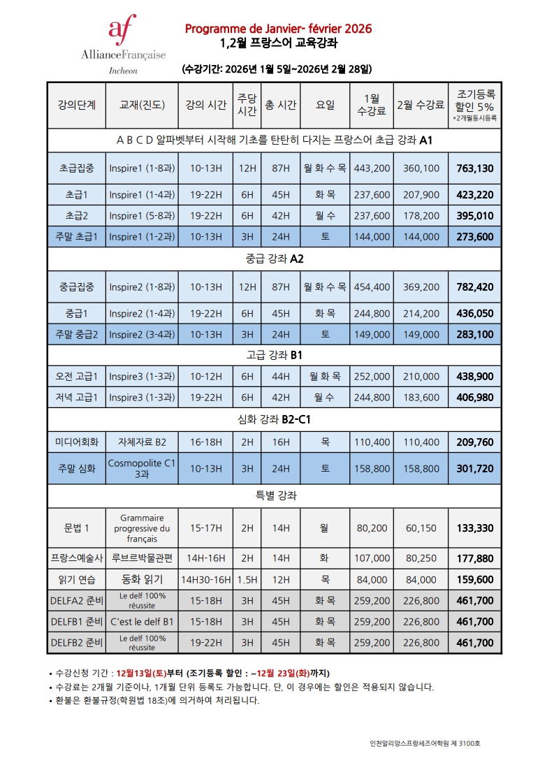 이번 2026년도 1-2월 프랑스어 강좌는 1월 5일(월) - 2월 28일(토) 동안 진행됩니다. 수업에 따라 강의 시작 후에도 중도 수강 가능합니다 :) * 학기는 2달 단위로 진행되며, 수강료는 2개월 기준이나 1개월 분할 결제도 가능입니다. (단, 이 경우에는 할인은 적용되지 않습니다.) (수강생이 5명 미만인 강좌는 폐강될 수 있으며, 폐강 시 결제한 수강료는 전액 환불됩니다.) ** 신규 수강자분들은 수강신청 전에 먼저 수강상담을 받으시기를 권해드립니다. 전화 예약 후 방문. (프랑스어를 아예 처음 배우거나 본인의 프랑스어 레벨을 정확하게 알고 있는 분이라면 수강상담이 필수는 아닙니다.) - 문의전화 : 032) 873-5556, 5550 - 카카오톡 : 인천알리앙스프랑세즈어학원 / allianceincheon - 상담가능시간 : 월,화,수,목 (10시-13시 & 15시00분-18시30분) / 토 (10시-12시30분) (점심시간인 13시-14시 30분에는 전화 받지 않습니다.) ____________ * 인천 이음카드 사용 가능 합니다. ___________ * 수강신청 방법: 직접 방문 혹은 위 연락처 (032-873-5556, 5550)로 “성함, 원하시는 강의명”을 말씀해주시길 바랍니다. * 수강료 결제방법: 계좌이체 / 신용카드(방문시) 가능 신한은행 110-548-199279 *현금영수증 발급을 원하시는 분들은 수강신청시 말씀해주시고, 송금시 예금주 성명이 본인과 다를 경우 반드시 사전에 알려주시기 바랍니다. ____________ ※ 인천 알리앙스는 교육청의 환불규정(학원법 18조)을 준수하며, 교습기간을 기준으로 환불의사 통보 시점에 따라 반환금액이 상이하오니 자세한 환불규정의 숙지바랍니다. 환불시 반환금액은 할인 적용 전 수강료를 기준으로 계산됩니다. ____________ 인천 알리앙스 프랑세즈 어학원 제 3100호
